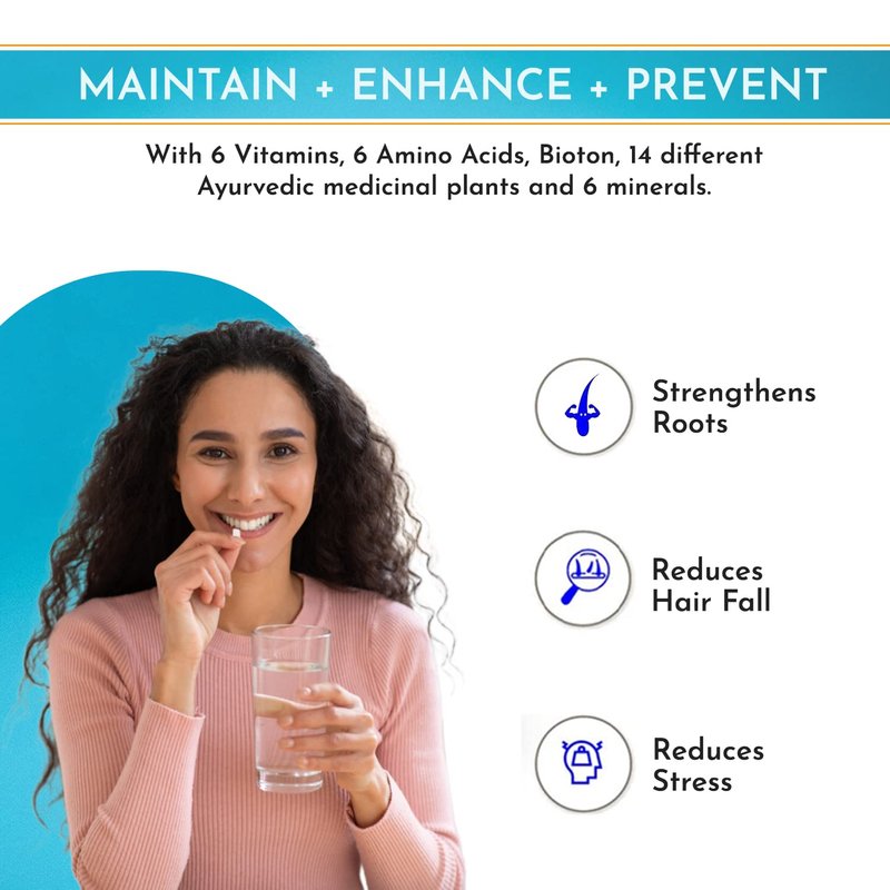 - Health Supplement: A comprehensive holistic supplement that has 6 Vitamins, 6 Amino Acids, Biotin, 14 different Ayurvedic medicinal plants and 6 minerals.