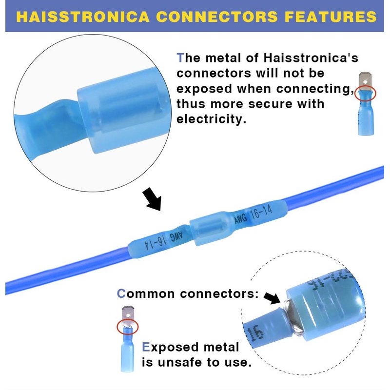 - LIVE WITHOUT LIMITS:Don't be held back by a humble looking wire connectors.Haisstronica heat shrink connectors are made of tinned copper.The tinning process is designed to effectively prevent copper from being oxidized and reduce resistance.While higher purity copper enhances electrical conductivity.