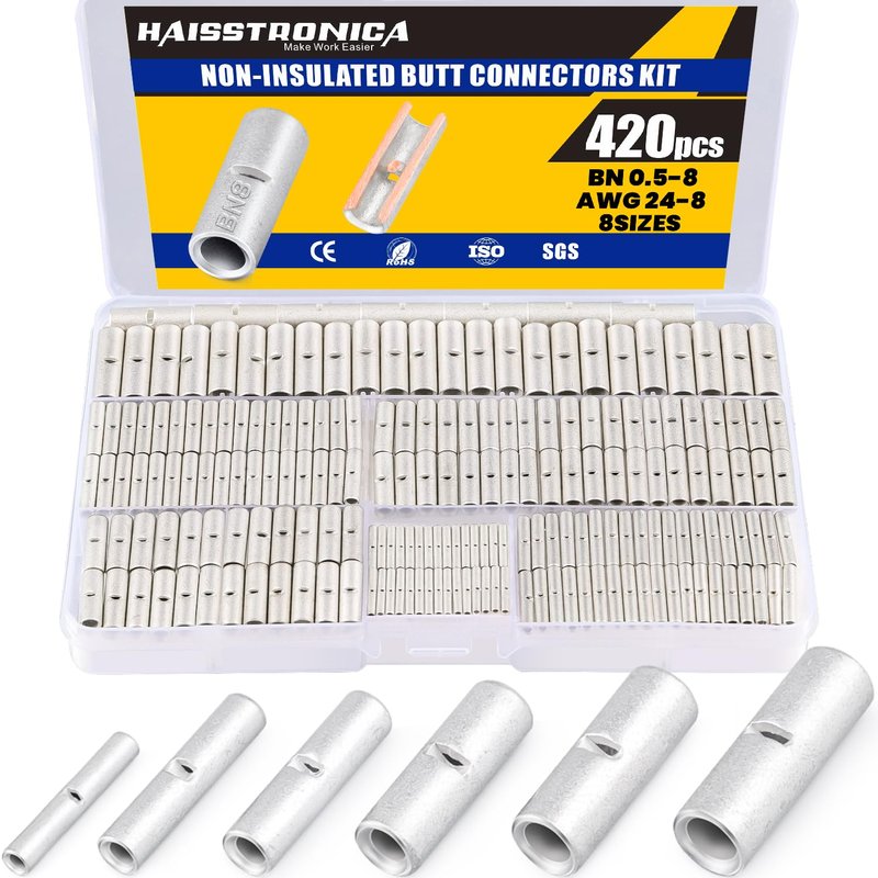 - Versatile Sizes:420pcs non-insulated butt connectors in a box,including 6 different sizes (AWG24-8),from small gauge wires to larger ones, these connectors can handle it all.