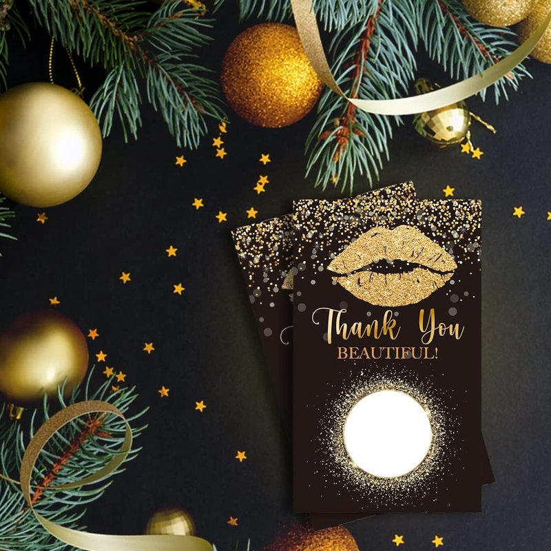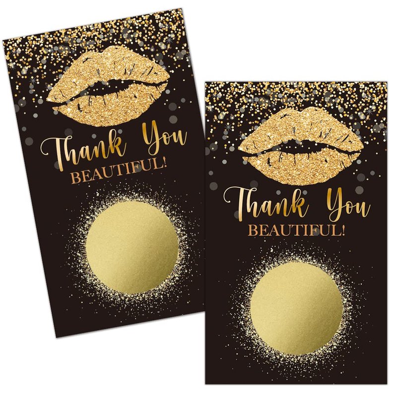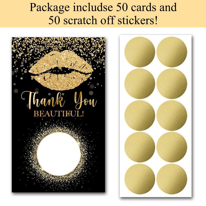 Haizct 50 Pack Thank You Blank Gift Certificate Scratch Off Cards for Small Business, Spa Beauty Makeup Hair Salon, Bridal Shower, Baby Shower, Country Wedding (Golden lip gloss)-GK095
