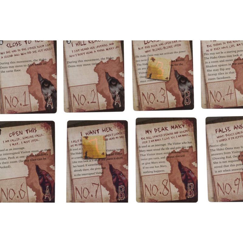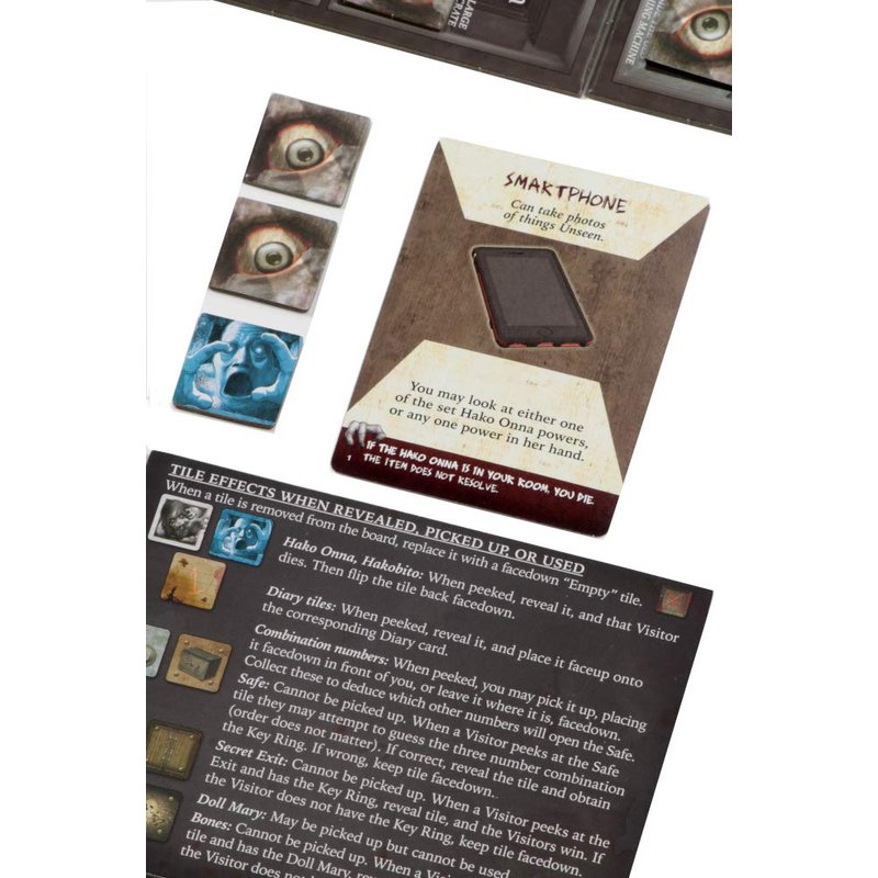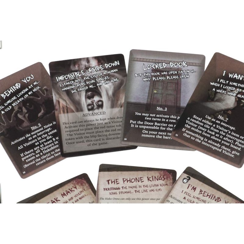 - WHAT YOU GET - 1 Hako Onna board, 5 summary boards, 9 room tiles, 58 story tiles, 1 noise tile, 6 noise discs, 1 door barrier marker, 38 cards, 6 noise cards.