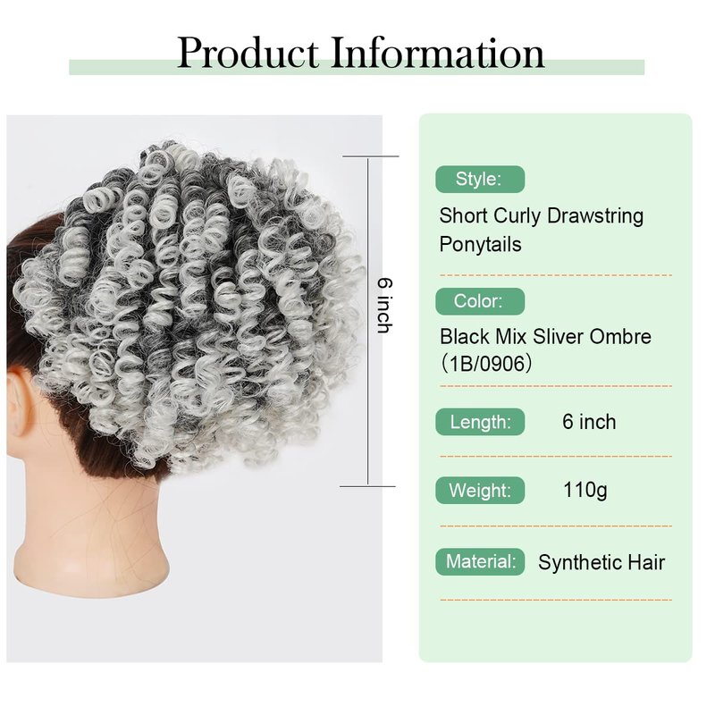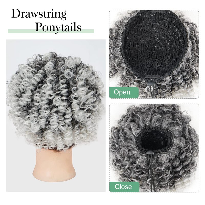 Halcyon Curly Ponytail Extension for Black Women Drawstring Ponytail Hair Extensions (6inch, Ombre Sliver)