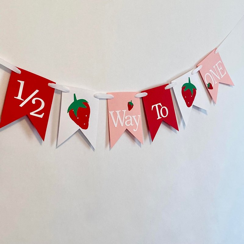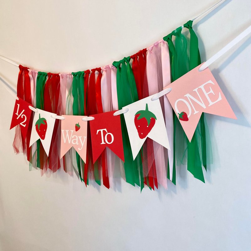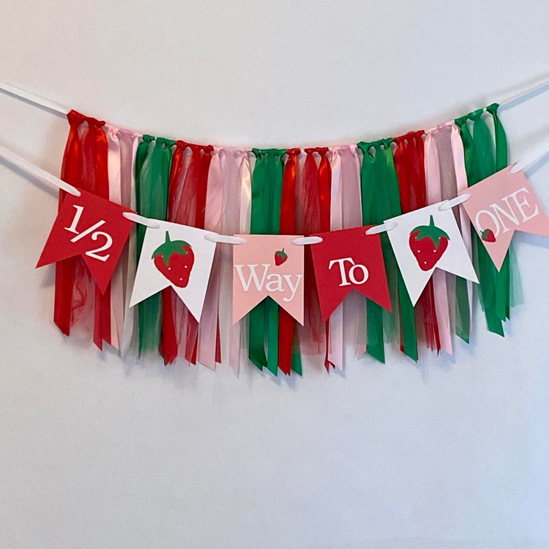 Celebrate your little one's half-birthday with this delightful decoration! This festive banner features a cheerful color scheme of red, green, and pink, with adorable strawberry motifs and the words "1/2 Way To One" adorning the banners. Crafted from lightweight card stock, the skirt banner and ribbons create a whimsical atmosphere perfect for commemorating this special milestone. Easily hang it up for a touch of joy and excitement as you count down to their first birthday. A wonderful addition to any half-birthday celebration, capturing precious memories in style.