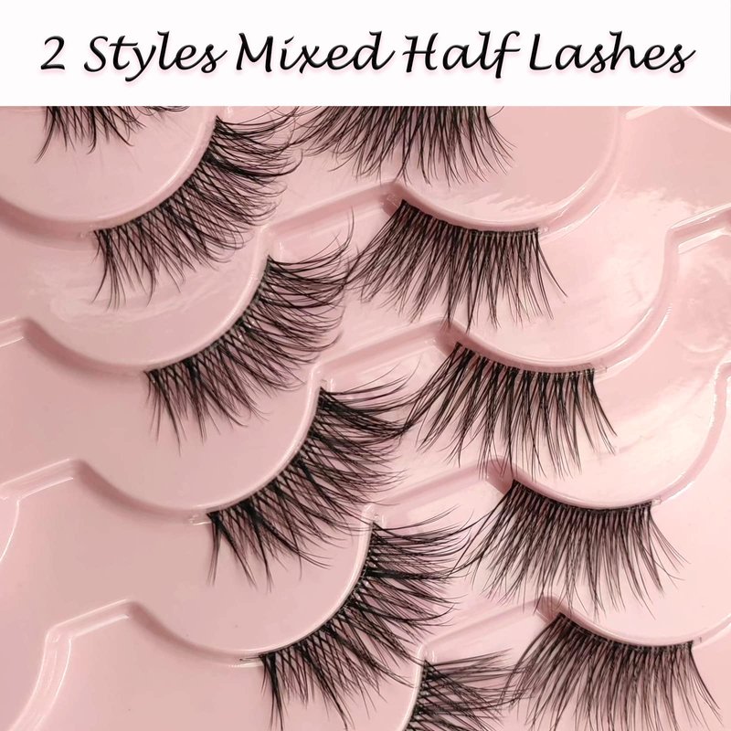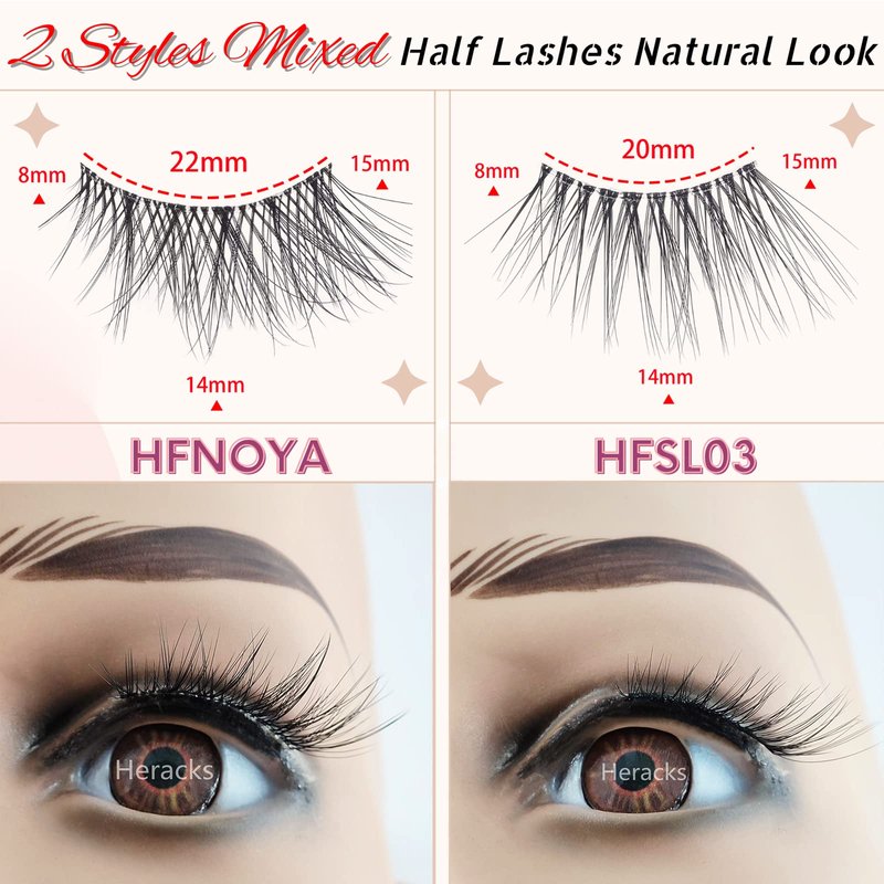 - 2 STYLES MIXED CAT-EYE MAKEUP: Heracks Half lashes14 Pairs are 2 styles mixed, have a cat-eye wing look. These wispy lashes have a flared volume, shorter inner corner, much longer at the end, create the illusion of "cat-eyes". Have the effect of deepening and enlarging your eyes.