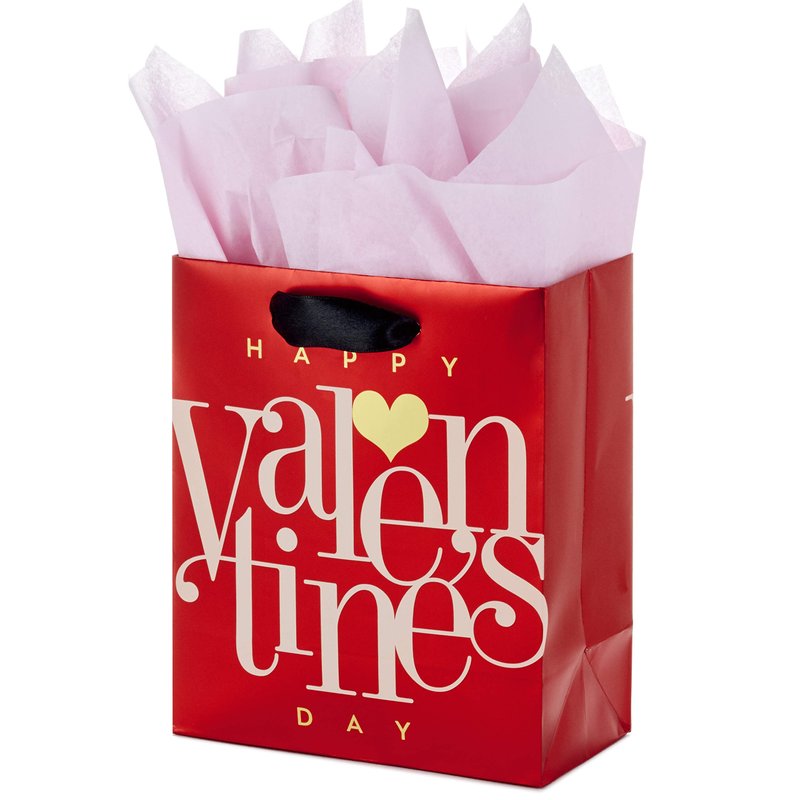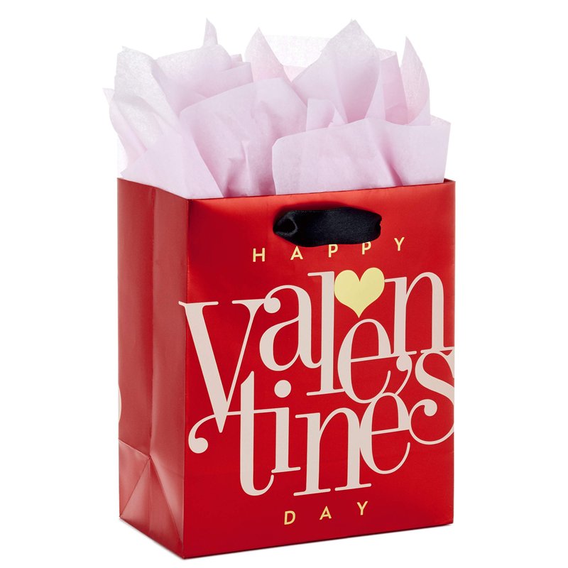 - A fun way to give a small gift, this red Valentine's bag features "Happy Valentine's Day" lettering accented with a gold heart. Black satin ribbon handles finish off a festive package.
