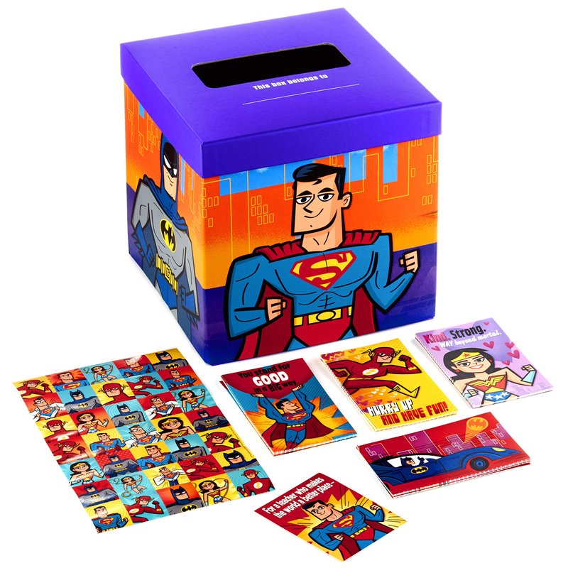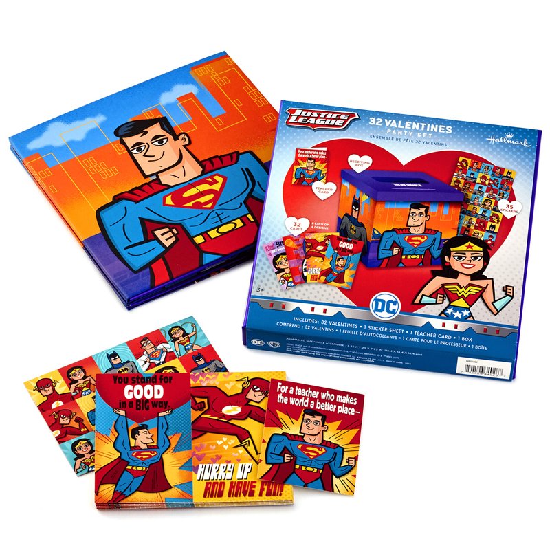Hallmark Justice League Valentines Day Cards and Mailbox for Kids School Classroom Exchange (1 Box, 32 Valentine Cards, 35 Stickers, 1 Teacher Card)
