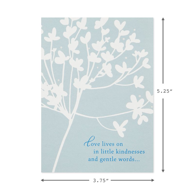 - Note cards feature a white cherry blossom design on a light blue background with lettering that reads: "Love lives on in little kindnesses and gentle words." Inside reads: "Thank you for your expression of sympathy."