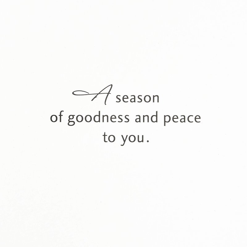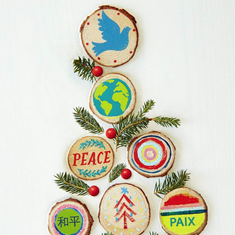 - Christmas cards feature a tree made of messages of peace in different languages, accented with glitter. Inside reads: "A season of goodness and peace to you."