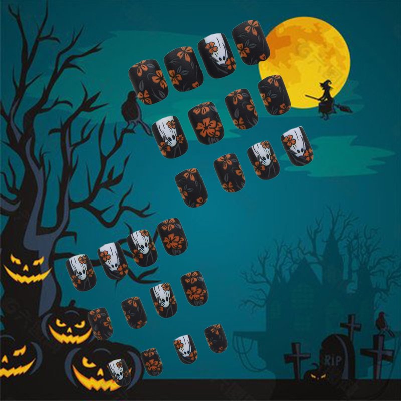 - 【Halloween Flower Fake Nails Package Contains】 24Pcs short false nails, 24 pieces of jelly glue, 1 mini nail file, 1 wooden stick. (Durability of jelly glue is not as good as liquid glue, but it makes fake nails reusable. Jelly glue can last about 3 days or more, glue remains longer.Please use your suitable glue according to different scenes)