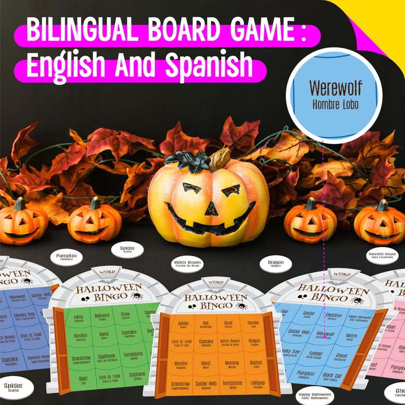 Halloween Bingo Game, 12PCS Bilingual English and Spanish Bingo Board Game, 12 Players Bingo Game Set for Teenager or Adults Halloween Party, Fun Interesting Activity Party Supplies