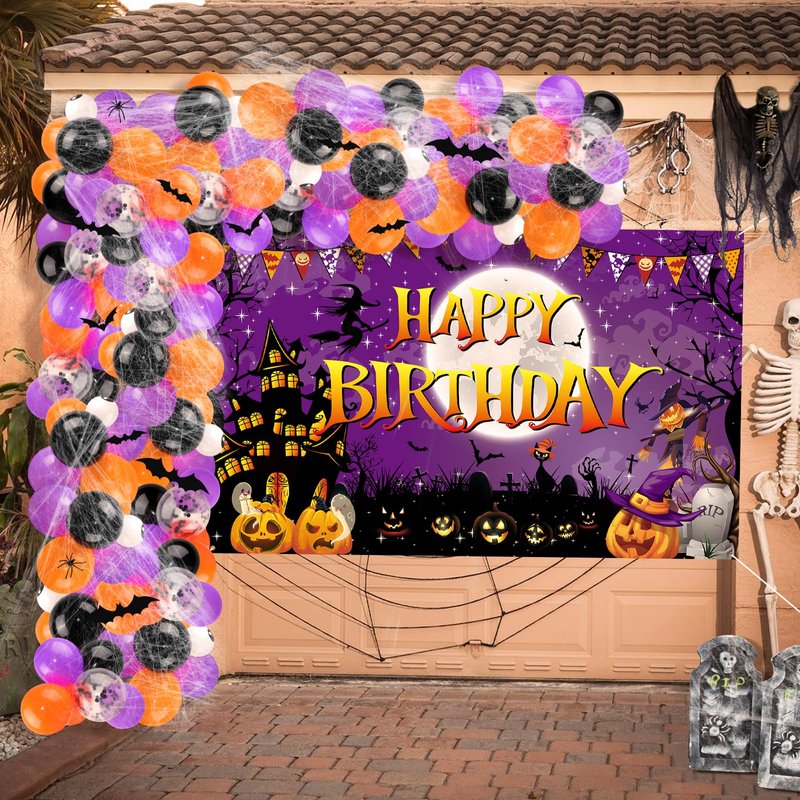 - Halloween Birthday Decorations: There is 1pcs Halloween theme birthday backdrop banner and 83pcs latex Halloween balloons garland arch kit with spider web, 2pcs spiders, 12pcs bats, 1pcs glue, 2pcs ribbons and 1pcs balloons chain .(20pcs orange balloons, 20pcs purple balloons, 20pcs black balloons, 5pcs black balloons with sequins, 8pcs black long balloons, 10pcs eye balloons) With these so many colorful Halloween balloons, its further set off a atmosphere of your Halloween birthday party.