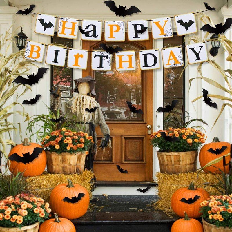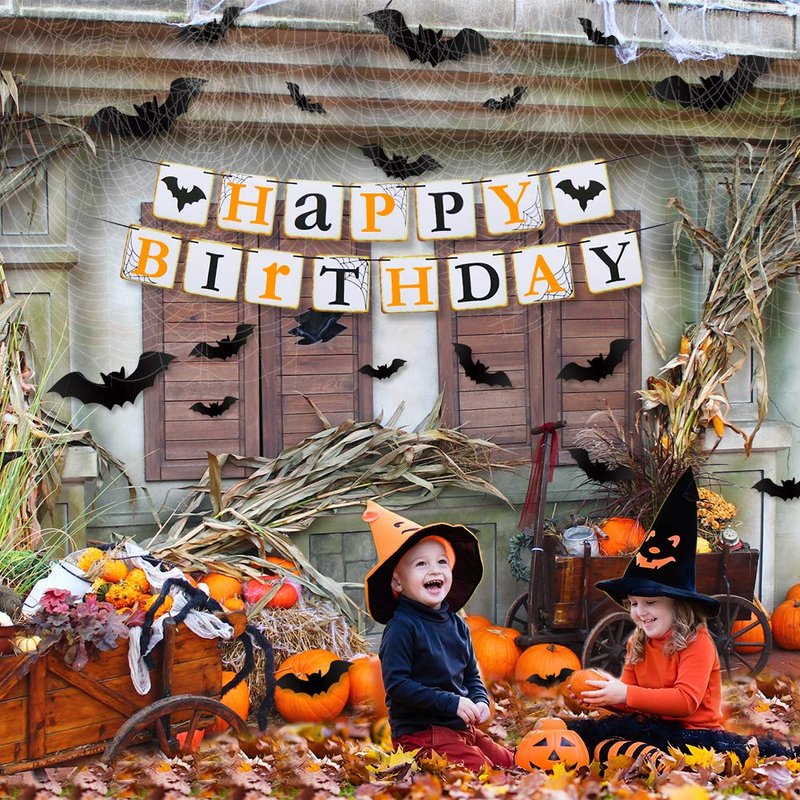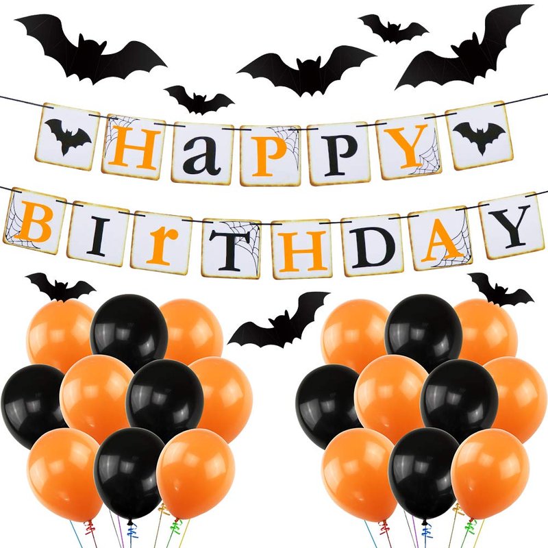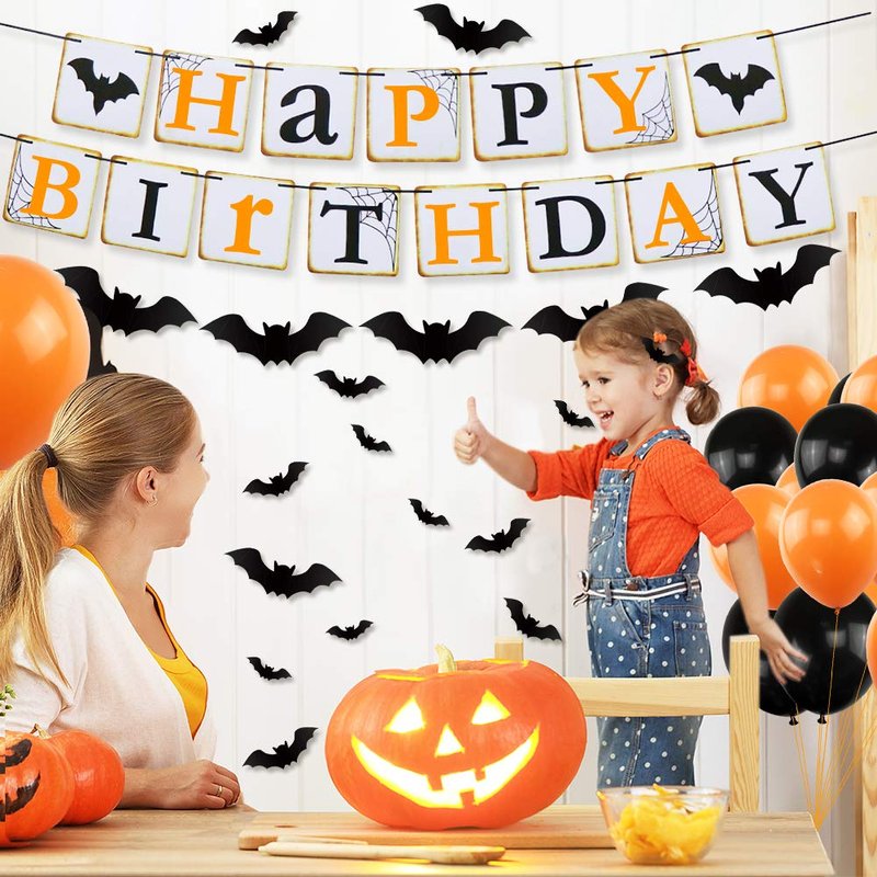 - These bright orange and black Halloween balloons is suitable the Halloween holiday atmosphere very well, and the 32 pcs 3D black bat and the happy birthday banner is a popular decoration for Halloween theme birthday These party accessories are not only used for Halloween but also great for Children "Theme" Activities, classroom rewards, birthday party décor, family birthday party supplies, festival, party decoration.
