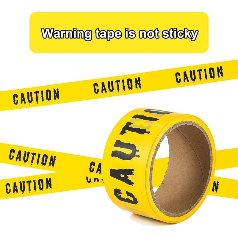 - šćHalloween Barrier Tape Black and YellowćThe crime scene tape measures 20 meters / 65.62 feet in total and 48mm /1.89 inch in width. Can be cutted into whatever length you want. A total of two rolls-This halloween warning tape is with caution text in fright font design, great ideal halloween accessories barrier tape for your unique Halloween Decor. Halloween Decoration in door & outdoor.PLEASE NOTE: NO sticky on the back.