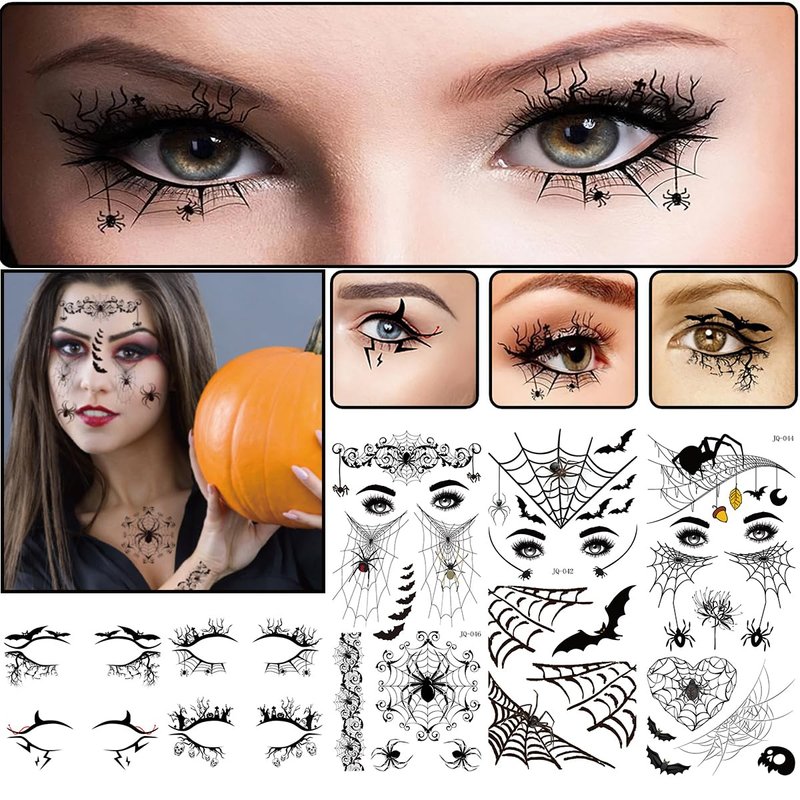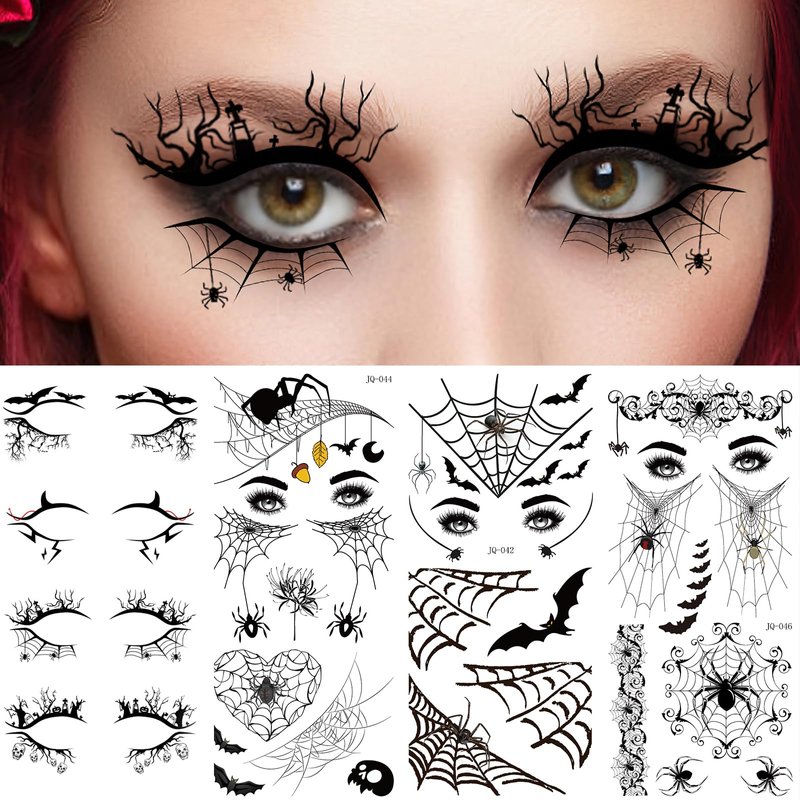 - Package content: You will get 8Pcs/4pair eyeshadow tattoo stickers and 3 large sheet spider web bat tattoos for the Halloween party face eye makeup tool