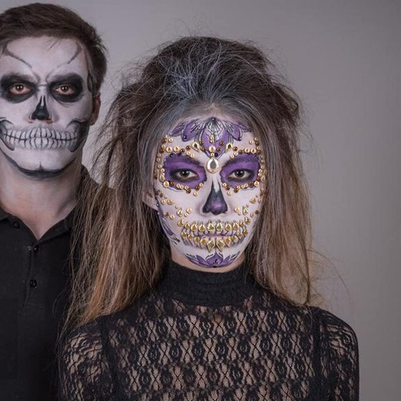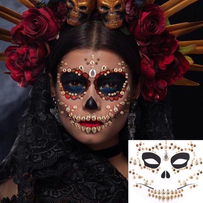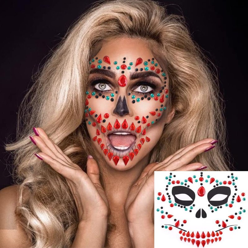 - 💎Halloween Face Jewels - 3 different styles unique day of the dead face gems tattoo sticker. Complete your festival outfit off with these amazing gems! Use these crystal holographic face jewels along with glitter to accent your beautiful makeup.