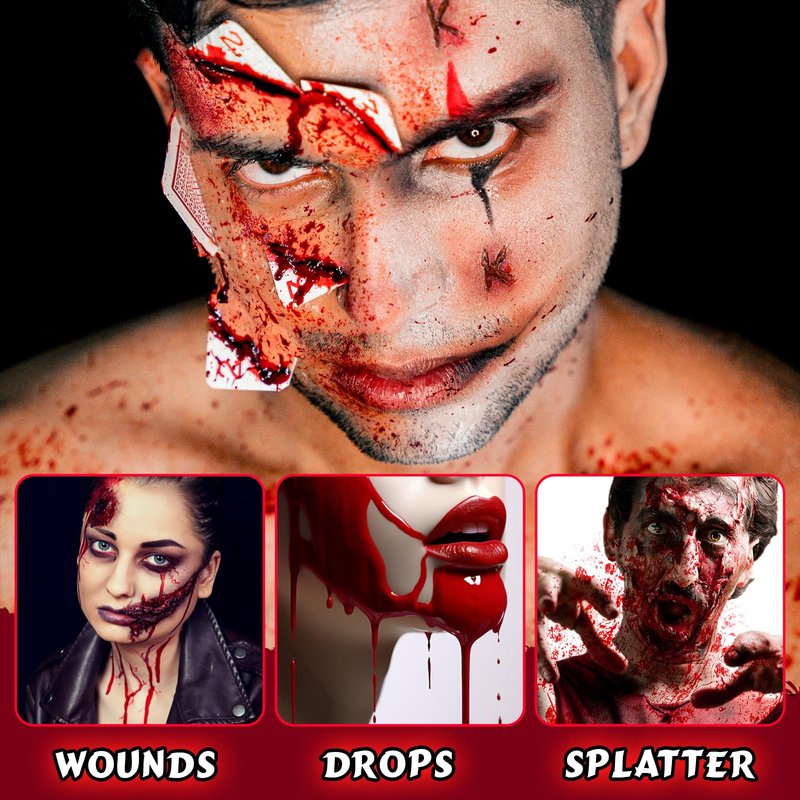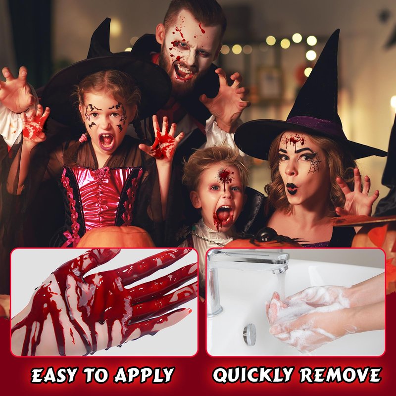 - Easy to Use&Washable:Vegan & Cruelty-Free Blood effect product is crafted with Friendly ingredients, the thin texture allows for easy application. Simply rinse with warm water and follow up with a soap cleanse, If bloodstains occur, they can be gently wiped away with makeup remover. Residue on clothing can also be eliminated by soaking in a mixture of warm water and detergent for half an hour.