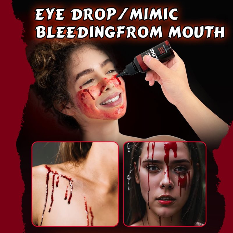 - Realistic effects Dripping Fake Blood for Eye Drops:We Provide a Black Dripper as a Gift,You can Use the Tip dripper to apply blood under eye to create fake blood tears. Dripping to Eye or Nose, arms and legs or the cloth;This makes it an ideal choice for creating terrifying, thrilling, or attention-grabbing character makeup effects.