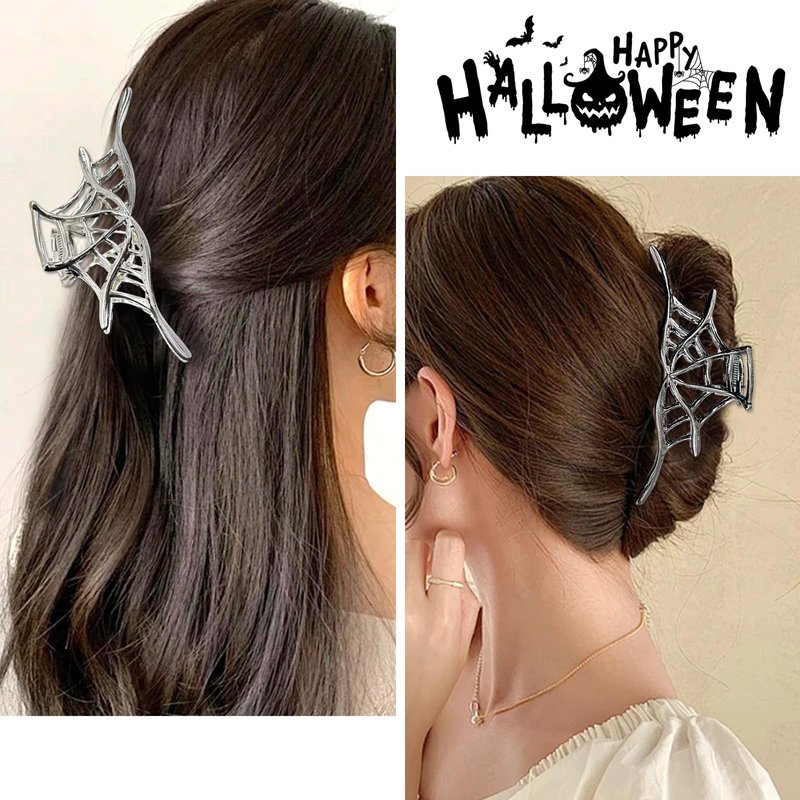 Get ready to elevate your Halloween look with our enchanting Halloween Hair Clips! These Hair Claw Clips, designed in a striking black and silver metal, feature a whimsical bat wings, skeleton hand, skull, spider web, spider motif that adds a touch of spooky elegance to any outfit.