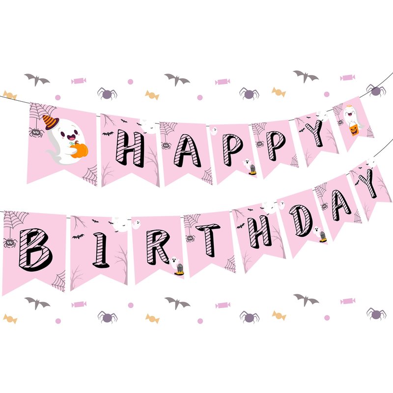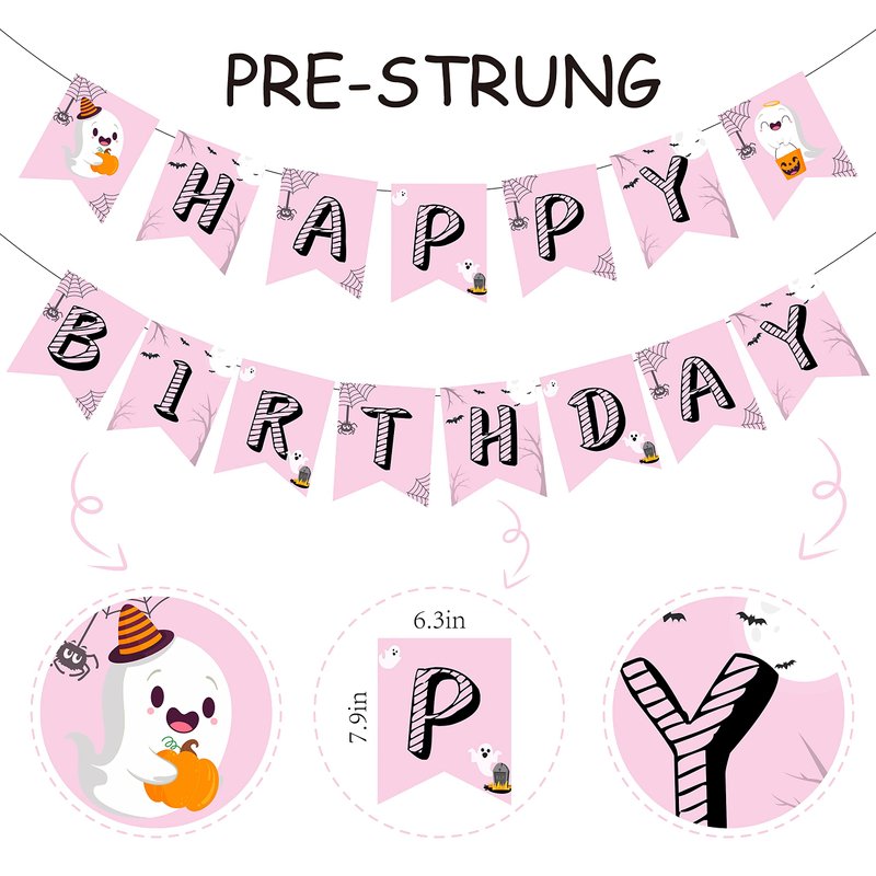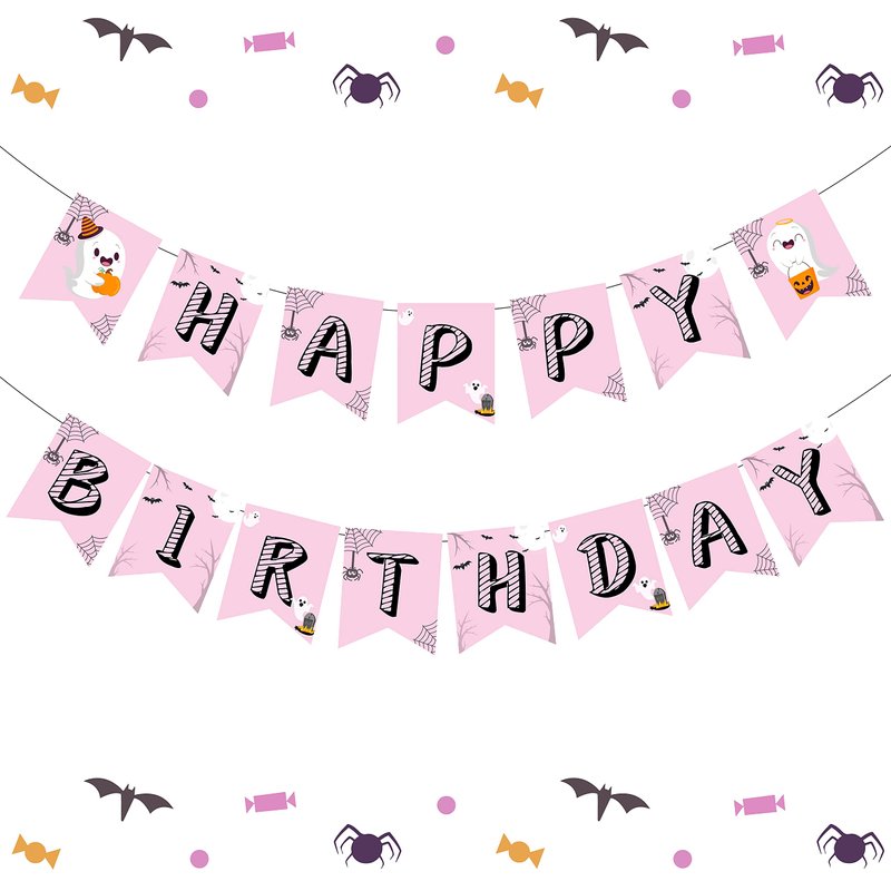 - Designed Banner: This happy birthday banner consists of 15 pieces, with pink as main color and black strip as letter pattern, small spider and bat are ornaments on the banner. Besides that, the happy banner have two cute baby ghosts decorations at both end, looking funny and lovely.