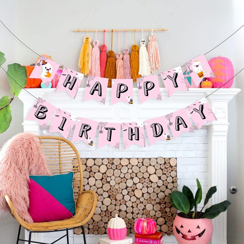 Pink Halloween Happy Birthday Banner Home Decor Halloween Wall Fireplace Banner for Girls 1st 2nd 3rd Birthday Decorations