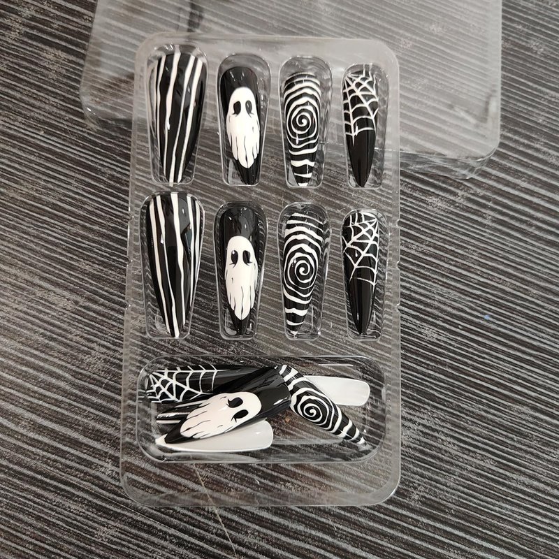 - Halloween Nails Design: Long pointed press on nails with white ghost design, black&white stripe spider web ghost elements are full of Halloween atmosphere, suitable for girls women DIY halloween styles nail art.