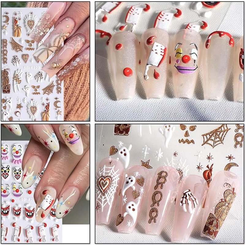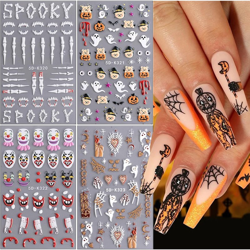 - ✨【Halloween Nail Art Stickers】: You will get 4 sheets 5D exquisite Halloween nail art stickers embossed carving sticker in one package. You can choose different patterns to decorate your nails, create a variety of dazzling Halloween nail design.