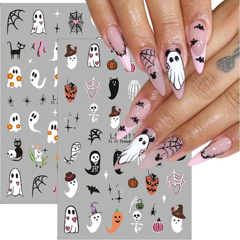 Halloween Nail Art Stickers Cute Ghost Pumpkins 3D Self-Adhesive Nail Decals Bat Skull Spider Web Designs Nail Stickers Halloween Nail Supplies Nail Art Design for Women Girls 6 Sheets