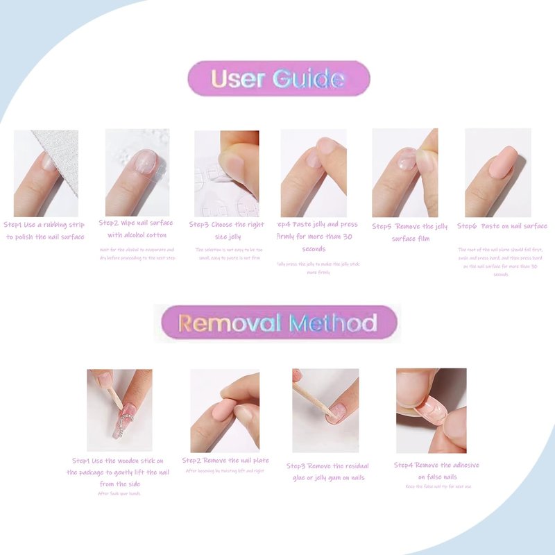 Package Contents: 24pcs false nails,24pcs Jelly glue, 1pc wood stick, 1pc mini nail file, 1pc alcohol pads.