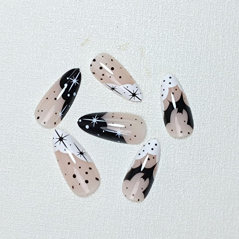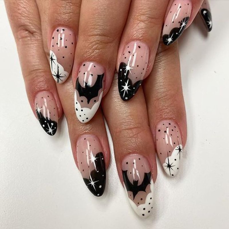 Halloween Press on Nails Medium Almond French Tip Fake Nails White&Black False Nails with Designs Bats Stars Glossy Glue on Nails Full Cover Acrylic Cute Artificial Nails for Women Manicure 24 Pcs