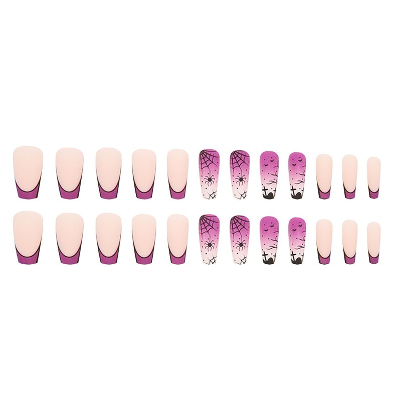 Halloween Press on Nails Medium Square Halloween Fake Nails Purple False Nails Spider Web and Spider Pattern French Tip Nails for Women and Girls 24 Pcs