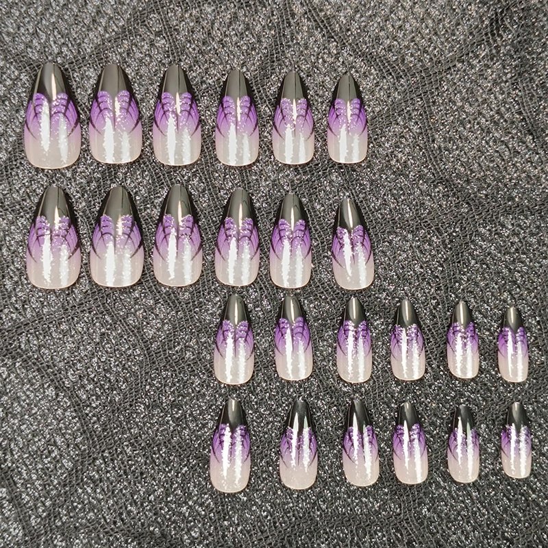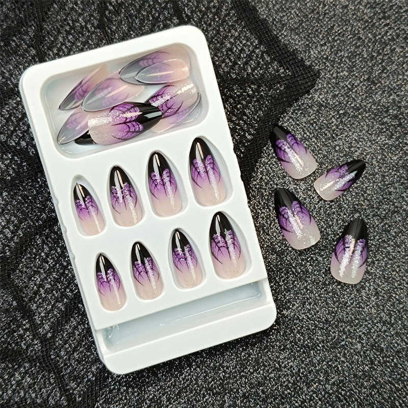 Halloween Press on Nails Short Almond Fake Nails Black Spider Web French Tip Acrylic Glue on Nails Full Cover Purple Gradient False Nail Stick on Nails Glossy Shiny Glitter False Nail for Women 24Pcs