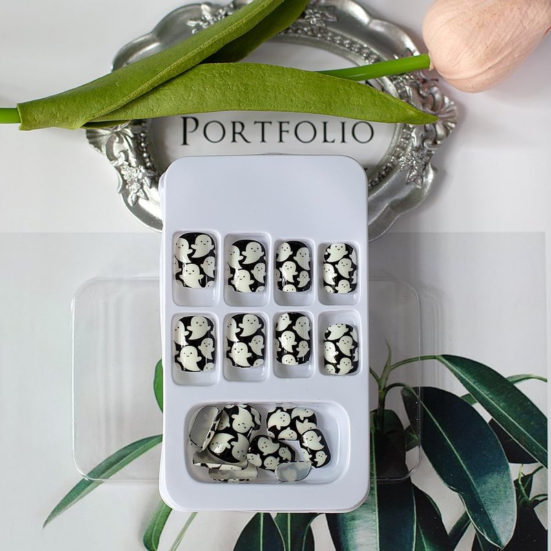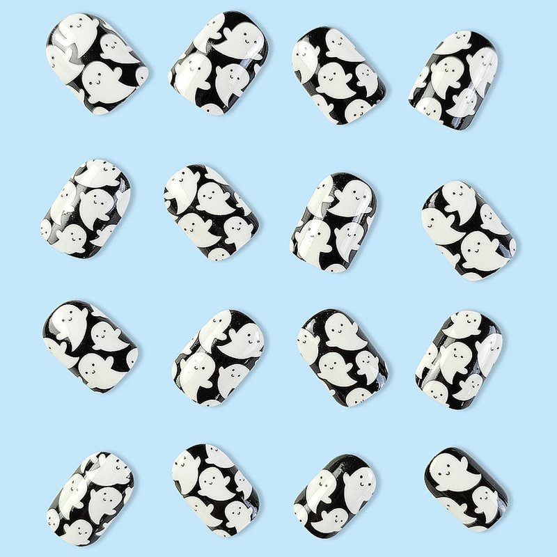 - đ»ăEye-catching Halloween Designă: Each nail in the set features adorable white ghost designs, perfect for Halloween or spooky-themed occasions.