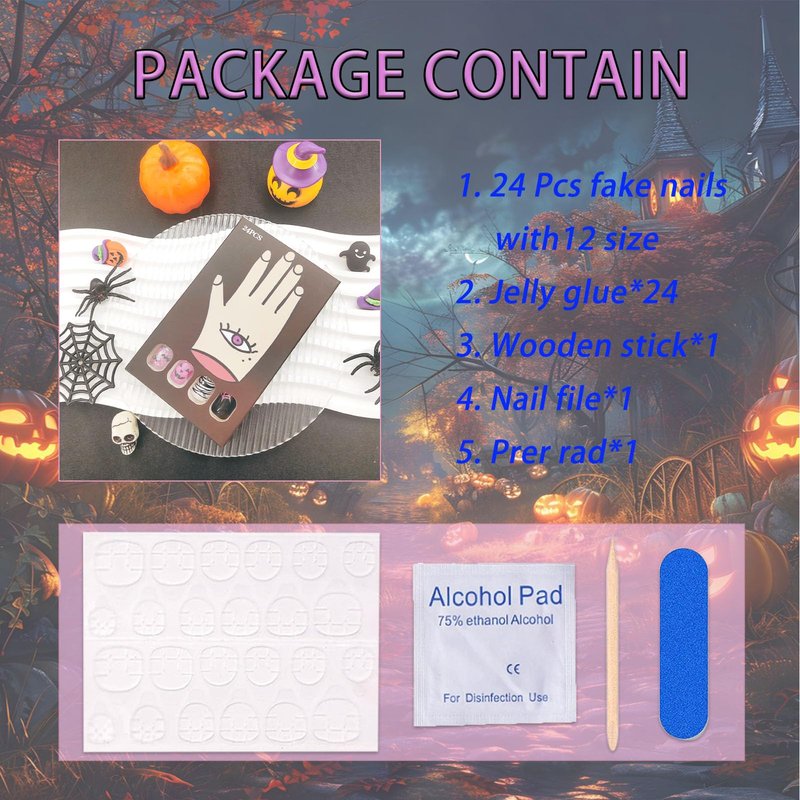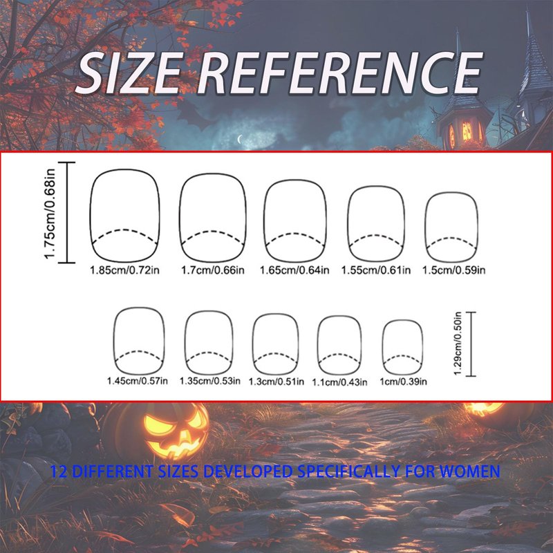 - What's Include: 12 nail sizes 24 halloween fake nails ensure a totally fit, plus we give you everything needed just in case! Each set comes complete with a storage box, adhesive tabs, double-sided nail file, cuticle stick, and prep pad.