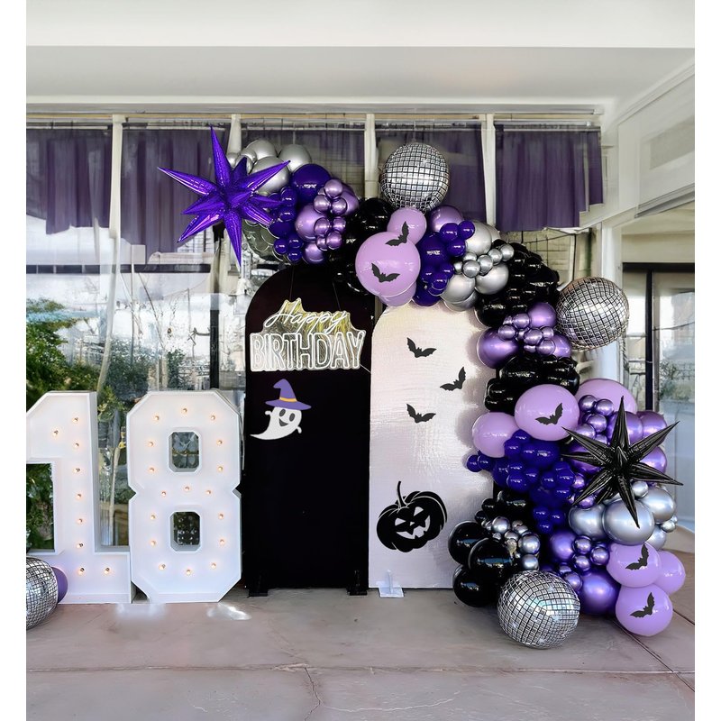 Halloween Purple and Black Silver Balloon Garland Arch Kit 132pcs withe Starburst disco ball Foil Balloons for girl 15/16th birthday New Year Wedding Prom Halloween Party Decoration