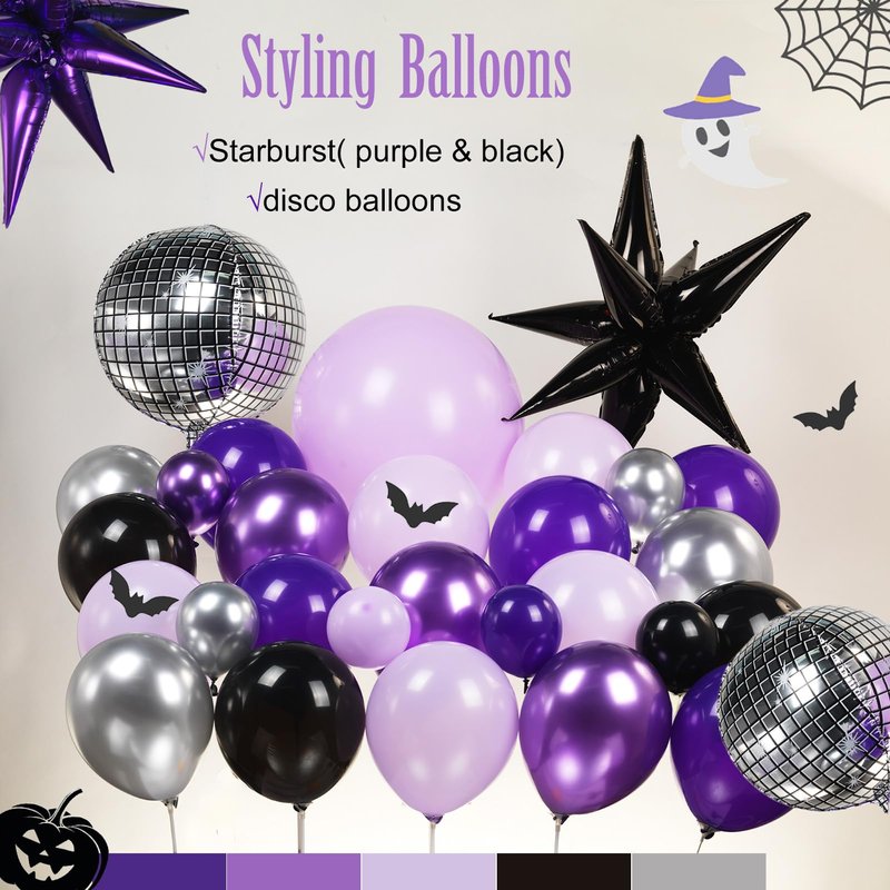 - 【For Many Occasions】The mix of silver disco balloons and purple black foil starburst balloons with latex dark purple, pastel purple and black, silver balloons has such a dramatic effect as they all have very contrasting colors and are so beautiful once set And stunning, quickly adds a festive festive atmosphere, perfect for Christmas parties, New Year's dances, birthday parties,wednesday Halloween party , nightmare before Christmas baby shower and more.