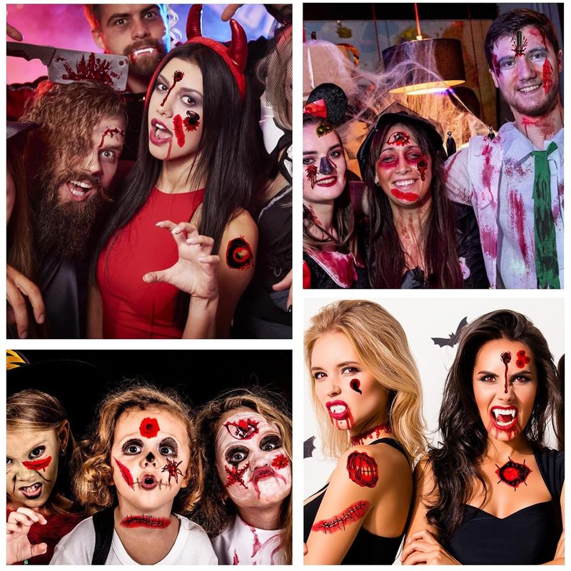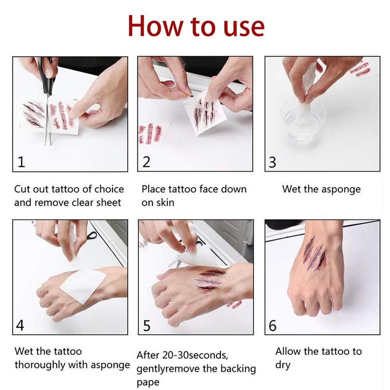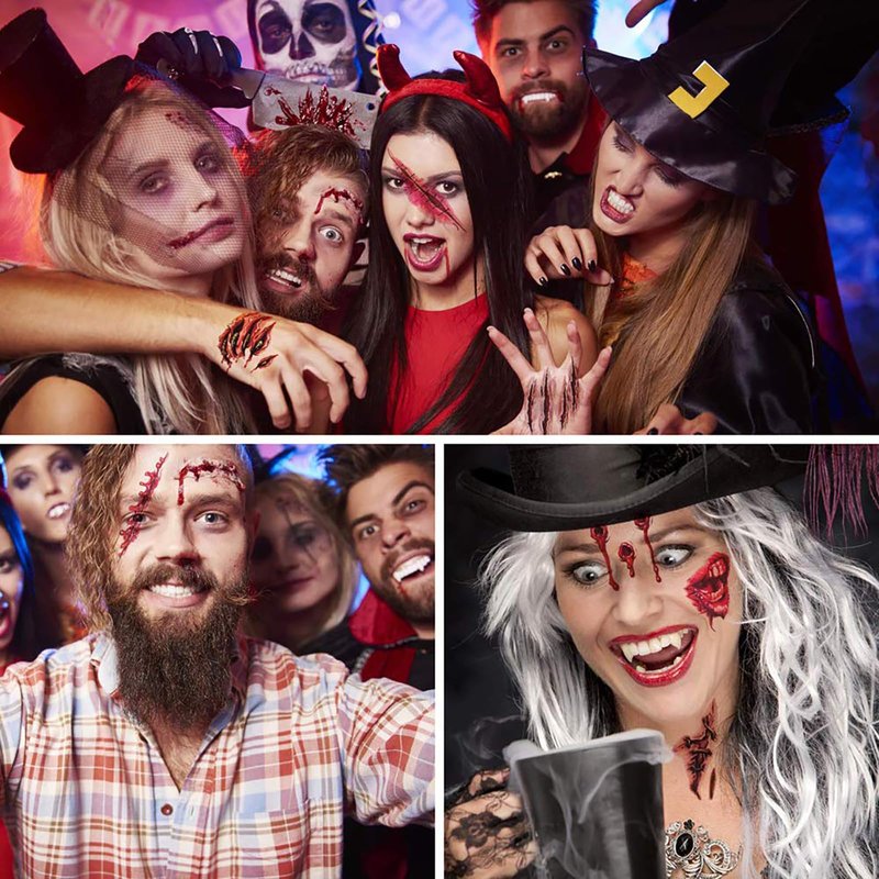 - Halloween Temporary Tattoos: Halloween bloody tattoos looks natural and realistic, you will feel as if they are really on the skin, great trick to astonish and scare your friends, this Halloween temporary wound stickers could last 2-7 days according to the position you stick it.
