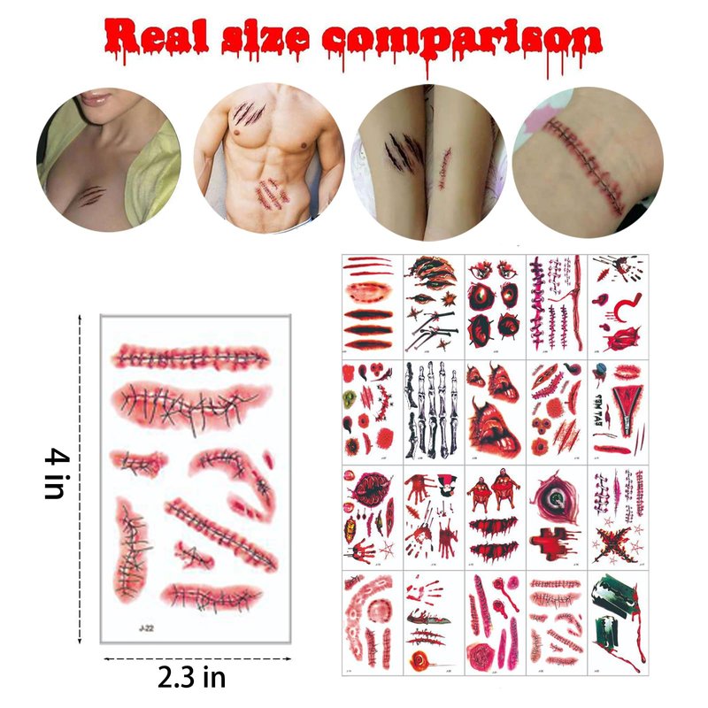 - Lifelike and vivid makeup props: 30 sheets of Halloween tattoos, Each sheet is approx 4 x 2.3 in, over 300 realistic and gory variety of styles for whatever you need. Scab, stitches, wounds, 3d scars and blood, bite marks and more, providing various feelings and surprises to the users; You can attach to the waist, chest, neck, arms, back, legs, paste to any body parts as you like.
