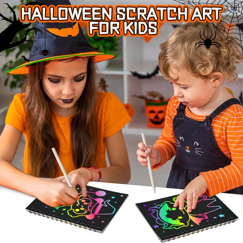 - Halloween Scratch Art for Kids Kits - This scratch art includes 16 pack scratch notebook, 18pcs wooden styluses, 16pcs drawing stencils, 18pcs Gift bags and 1pcs gift box. Just scratch off the black coating on the drawing paper, and rainbow lines will appear. Children can also use the stencils to design more cute and funny shapes on the scraped paper to create colorful paper artworks.Adding a colorful touch to your scratch art themed party and other special occasions.