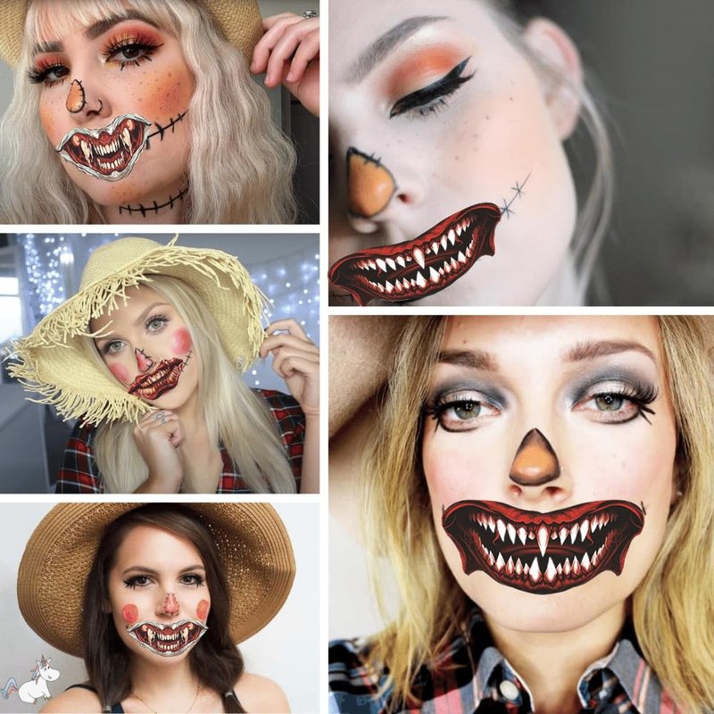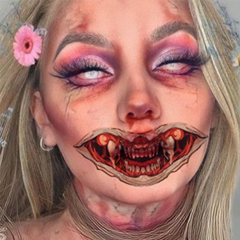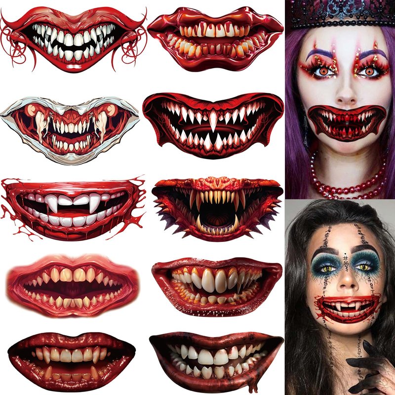 Halloween Temporary Horror Scary Mouth Face Tattoo Stickers Props for Women Adults Men Cosplay Party Masquerade Accessories Kit