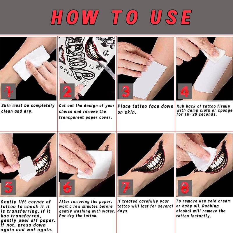 - ✔Safe Tattoo Material: Halloween temporary tattoos are printed with high quality tattoo ink and paper meeting rigid safety and NON-TOXIC materials requirements. Do not apply to sensitive skin, near eyes, or if you are allergic to adhesives.