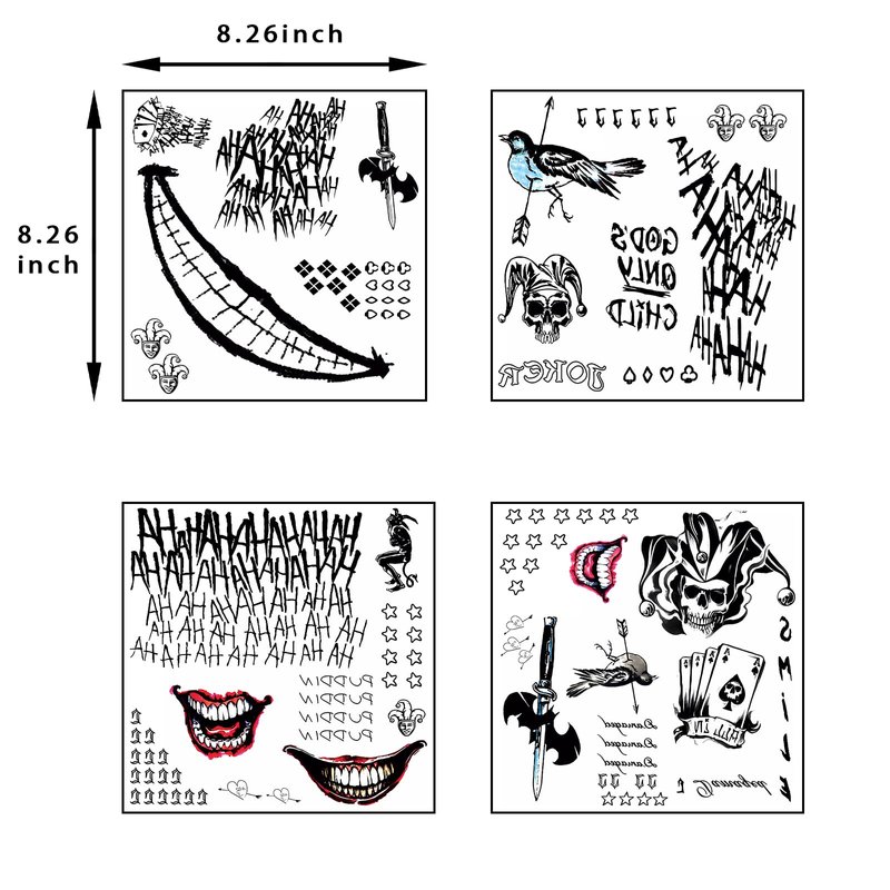 - ✔Halloween Tattoos Kits: You will get 4 sheets Joker Tattoos for Halloween, each sheet size is: 21*21cm/8.26*8.26in, It contains a variety of tattoos in total, as picture, It's can meet your needs enough.
