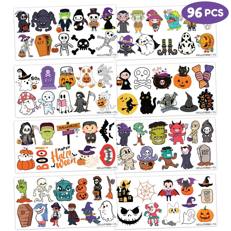- 🎃【IDEAL TATTOOS FOR THEMED FUNNY HALLOWEEN DECOR】: This set of temporary Funny Halloween-themed tattoo stickers comprises 8 sheets in total, featuring a total of 96 adorable, distinct designs. They are excellent for distributing as party favors and small gifts with a Funny Halloween theme for holidays. Each sheet measures 6.1 * 3.1 inches, making them suitable for kids of all sizes.