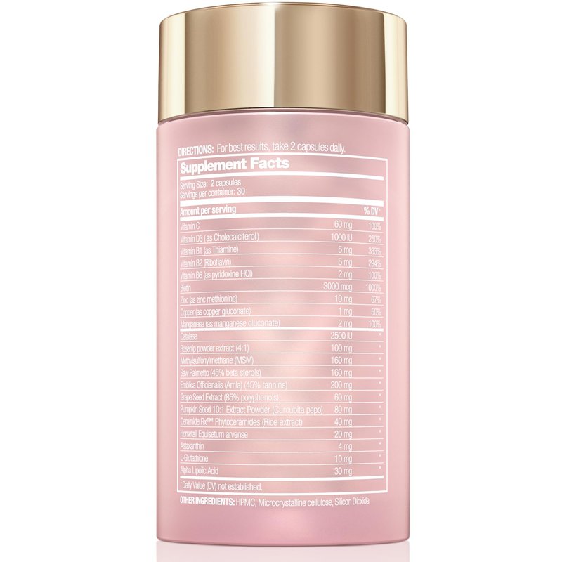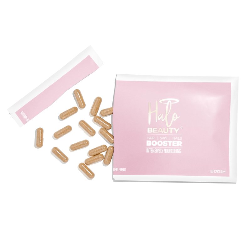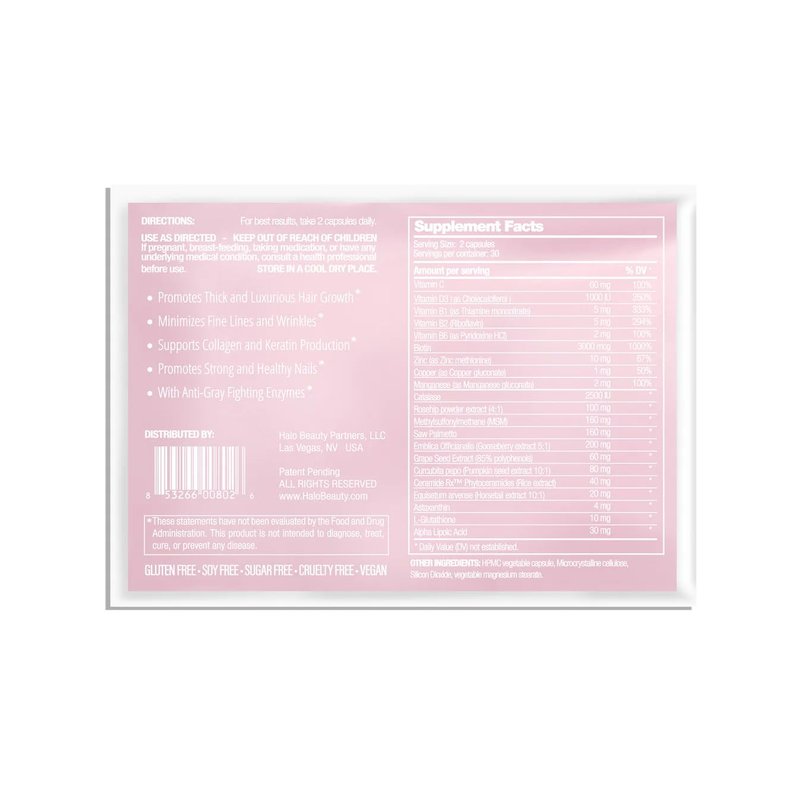Transform Your Beauty From The Inside Out Halo Beauty Hair, Skin & Nails Booster is a powerful, patent-pending formula scientifically designed to enhance your natural beauty. Our carefully selected ingredients work synergistically to promote thicker hair, glowing skin, and stronger nails. YOUR BEAUTY JOURNEY: Every body is unique, and your beauty transformation will unfold at its own perfect pace. Many customers report seeing gradual improvements that become more dramatic with consistent daily use. We recommend documenting your journey with photos to capture your personal transformation. PRO TIP: Take before photos when you start and progress photos periodically to see your amazing results! KEY BENEFITS: - Promotes thick, luxurious hair growth and fights thinning* - Minimizes fine lines and wrinkles while improving skin elasticity* - Strengthens brittle nails and accelerates healthy nail growth* - Contains anti-gray fighting enzymes to maintain natural hair color* - Supports overall beauty from within with comprehensive nutrition* PREMIUM INGREDIENTS WITH PURPOSE: - Biotin (5,000mcg): Supercharges hair growth and nail strength - Rosehip Powder Extract: Rich in antioxidants for radiant skin - Saw Palmetto: Combats hair thinning and promotes thickness - Vitamins C & D3: Essential for collagen production and skin health - MSM & Phytoceramides: Hydrate skin and restore youthful elasticity WHY CHOOSE HALO BEAUTY? Made with the highest-quality ingredients, Halo Beauty is manufactured in the USA in our state-of-the-art facility, adhering to strict FDA and cGMP guidelines. Our formula is free from harmful additives—just pure, potent ingredients that work. FOR BEST RESULTS: Take one capsule daily with food. Consistency is key—continuous daily use allows the premium ingredients to work effectively. While individual results vary, maintaining your beauty routine with Halo Beauty provides ongoing support for your hair, skin, and nails. Our proprietary blend is gluten-free, cruelty-free, soy-free, sugar-free, and vegan-friendly. Experience the power of science-backed ingredients designed to bring out the best in your hair, skin, and nails—naturally. *These statements have not been evaluated by the FDA. This product is not intended to diagnose, treat, cure, or prevent any disease.