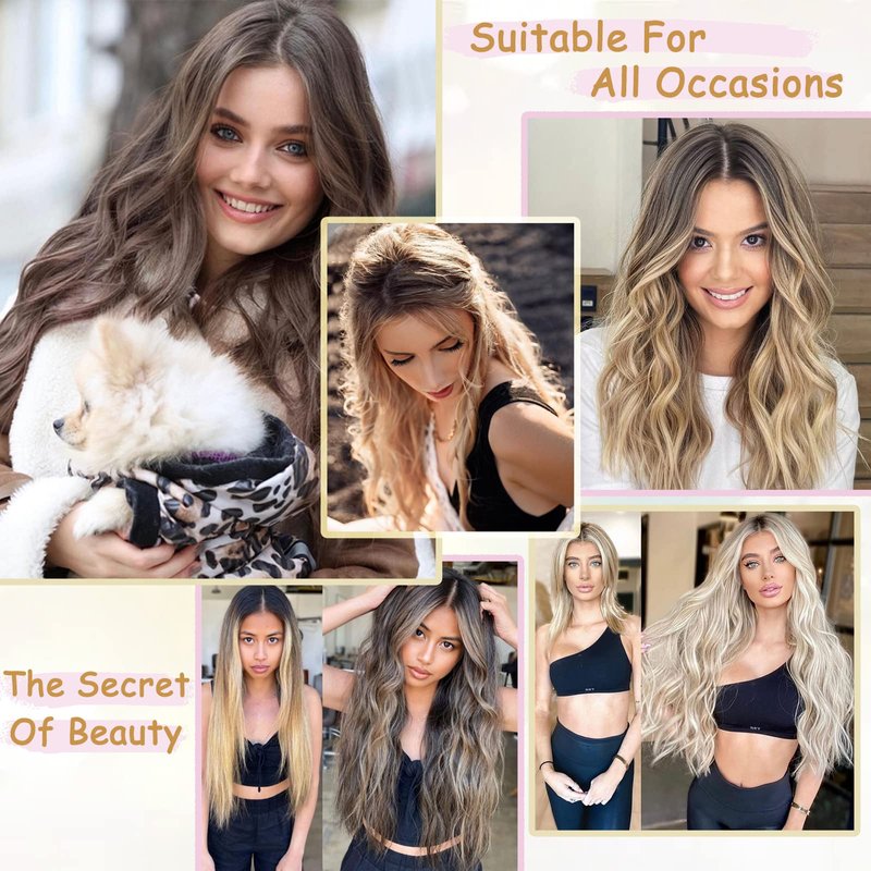 NEW Fashion Invisible Wire Hair Extensions -- More Comfortable & Natural & Lighter! -- Make you the Brightest Star ! Specifications 1. Name: Halo hair extensions, Invisible Wire Hair Extensions 2. Material: 100% high quality temperature resistant fiber 3. Length: 20 inches, 4. Color: Brown mix Blonde Hair Extensions 5. Comfortable and Secure:It has 2 diffrent length invisible wire and 4 clips.Two sizes of invisible wire with multiple adjustable sizes can perfectly fit whatever head circumference. At the same time, four clips make it more firmly connected, so that you can wear the hair extension without worries. 6. Beauty Uses: Parties, bars, activities, festivals, celebrations, They can be styled to create different looks just like your own hair , show off your beauty on different occasions. Hair extensions care: You can add conditioner and water to the bottle and spray it in the secret hairpiece.Then comb it with your fingers or wide-toothed.This makes the synthetic hairpieces look less dry and reduce hair loss and tangle.And please wash your long wavy secret hair extensions with warm water.The best way is to wrap the invisible secret extensions in a towel to absorb water and then dry it naturally.