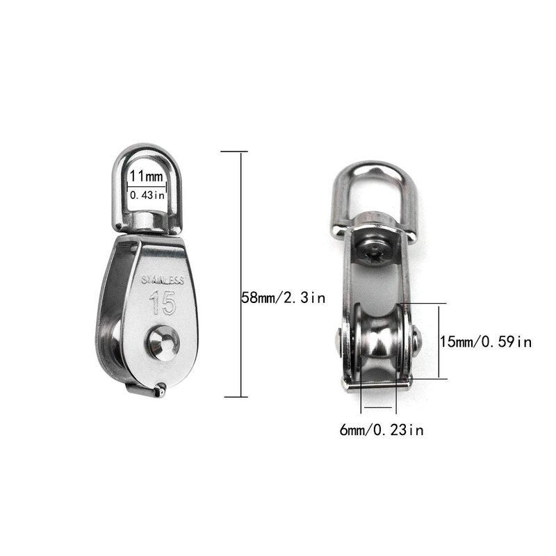 - Packaging includes:2 PCS Stainless Steel Pulley, 2 PCS Stainless Steel Spring Snap Hook