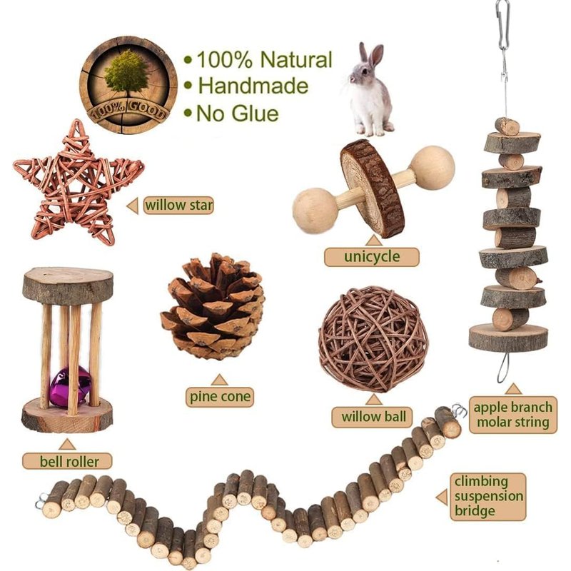 - 【FUN GUINEA PIG TOYS】The guinea pig chew toys set includes 1 Long climbing ladder suspension bridge, 1 willow hamster ball toy, 1 willow branch star toy,1 bell roller, 1 pine cone, 1 unicycle and 1 apple branch molar string. Pefect rodent cage accessories.