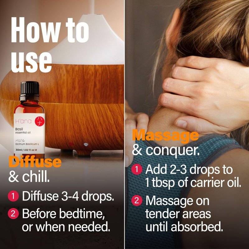 - FRESHLY HERBACEOUS FOR PEACEFUL ROUTINES. Diffuse 3-4 drops of 100% natural basil essential oils for 30 mins to enjoy its soothing aroma. Basil oil may be a tranquil addition during evening routines, or before bedtime.