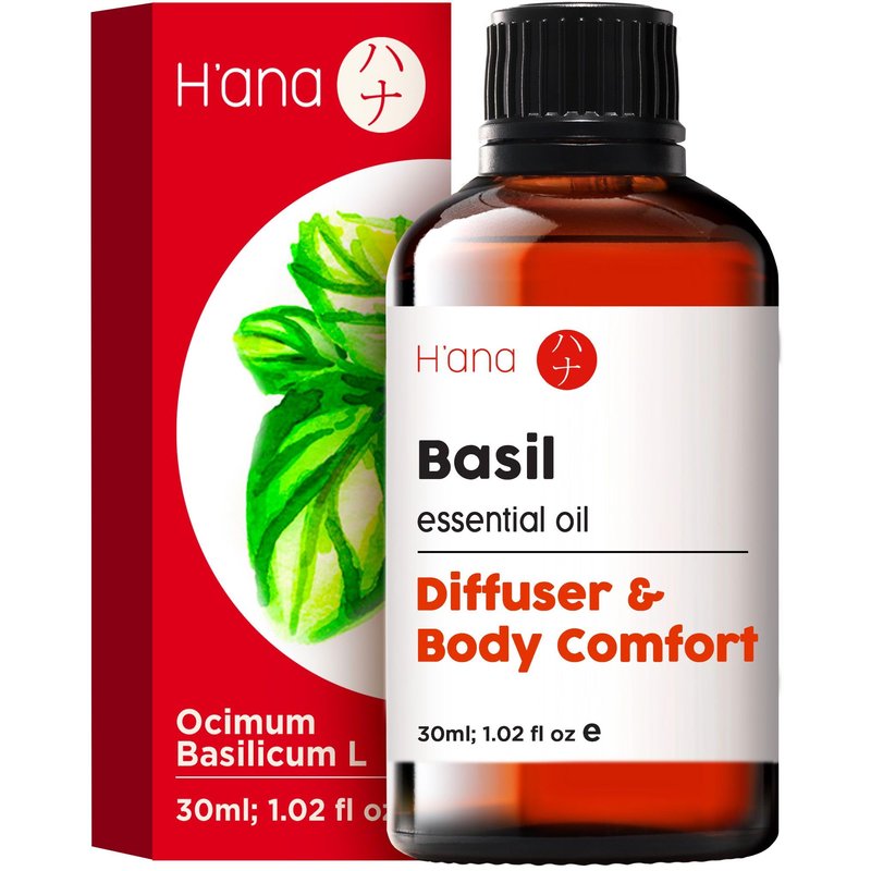 H’ana Basil Essential Oil for Diffuser - 100% Natural Basil Oil Essential Oil for Hair, Herbaceous & Refreshing Aroma (1 fl oz)
