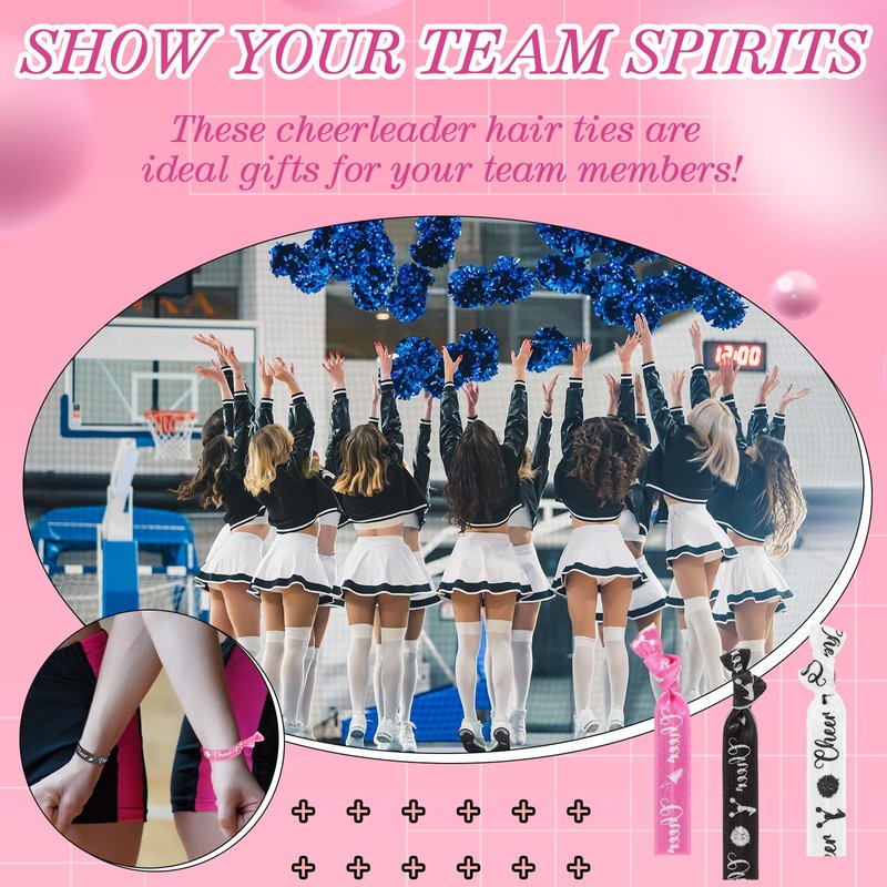 Features: Thoughtful gifts: Contained in a package that exudes cheerleading spirit, cheer team gifts make for thoughtful gifts. Treat your cheerleader friends, teammates, or even coaches with this practical and stylish accessory, showing them love and appreciation. More than a hair tie: Cheerleader party favors serve to reinforce cheerleading spirit, helping teams to stay united in look and spirit. Whether worn in your hair or as bracelets, these hair ties will make a lasting impact. Specifications: Color: pink, black, whiteSize: about 3.54 x 0.59 inches/ 9 x 1.5 cmPackage includes: 24 x Cheerleading hair tiesNotes: Manual measurement, please allow slight errors on size. The color may exist a slight difference due to different screen displays.