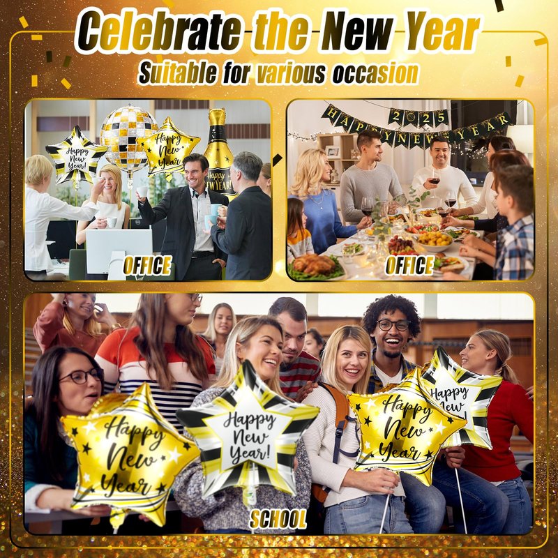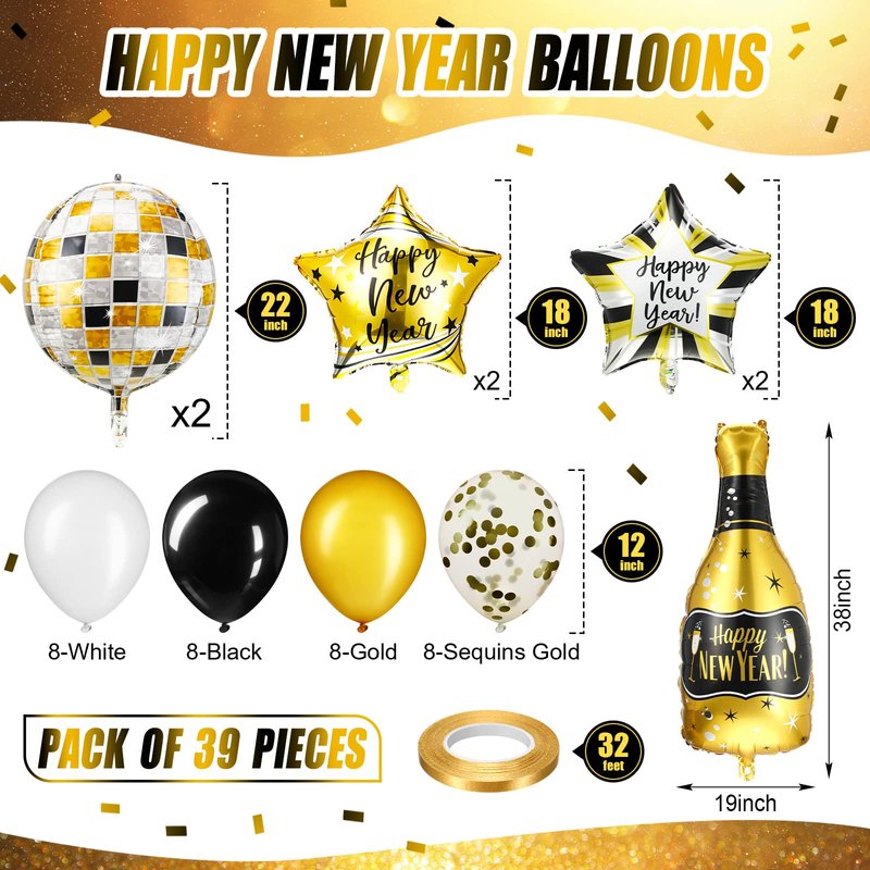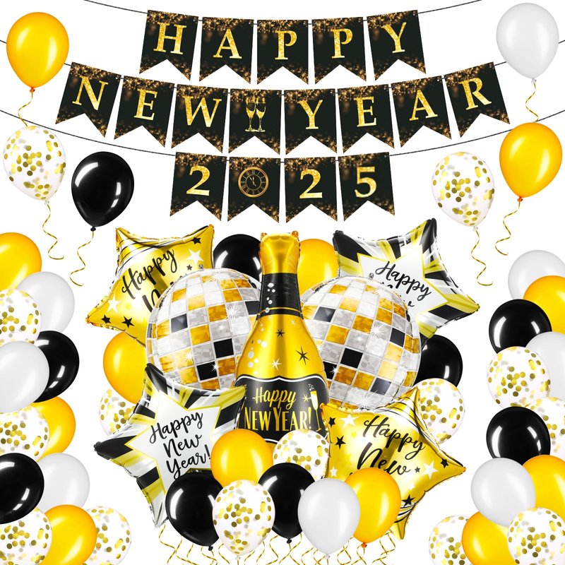 - Happy New Year Decorations 2025 Kit: the package contains 32 pieces of 12 inch latex New Years Eve party balloons in 4 styles (8 pieces per style), 2 pieces of 22 inch foil disco balloons, 4 pieces of 18 inch foil star balloons in 2 styles (2 pieces per style), 1 piece of 38 inch foil champagne bottle balloon, 1 set of 3 pieces 2025 happy New Year banners, and 1 roll of gold ribbon, a nice set for you to decorate your New Year party